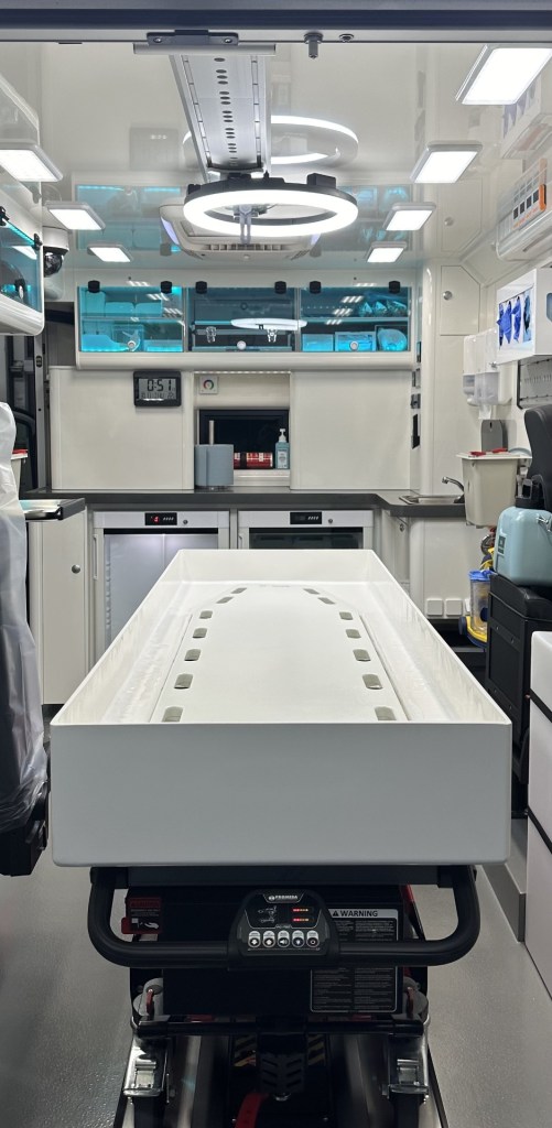 Our mobile laboratory is a high-tech vehicle that we use for both preservation and transport. The vehicle has a table for the donor body, which can be moved up, down, and sideways on a hydraulic stretcher with wheels, to easily grant access to the patient for the procedure. Multiple cameras allow us to document the procedures for future analysis and training. If desired, a live audio/video stream permits remote participation of team members. Once the brain is preserved, it can be stored in our regular laboratory. This is also where we prepare brain samples for microscopy.